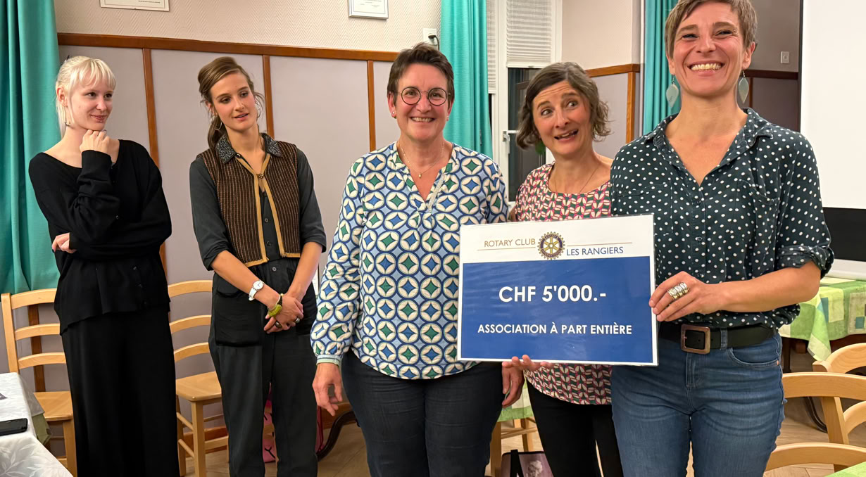 Le Rotary Club Les Rangiers, à l’initiative de sa présidente Mme Geneviève Constantin-Zufferey, a choisi de soutenir le projet novateur de l’association «A Part Entière», installée à Delémont. L’association propose une année de césure aux jeunes de 15 à 25 ans, visant à leur offrir une pause pour s’explorer et développer leurs compétences humaines avant de choisir une orientation professionnelle. Confiance en soi, audace, créativité, lien à la nature, développement de projets, «A Part Entière» est un laboratoire de possibles. Un montant de 5'000 francs a été attribué à l’association qui restera en contact avec le Rotary Les Rangiers tout au long de l’année rotarienne.